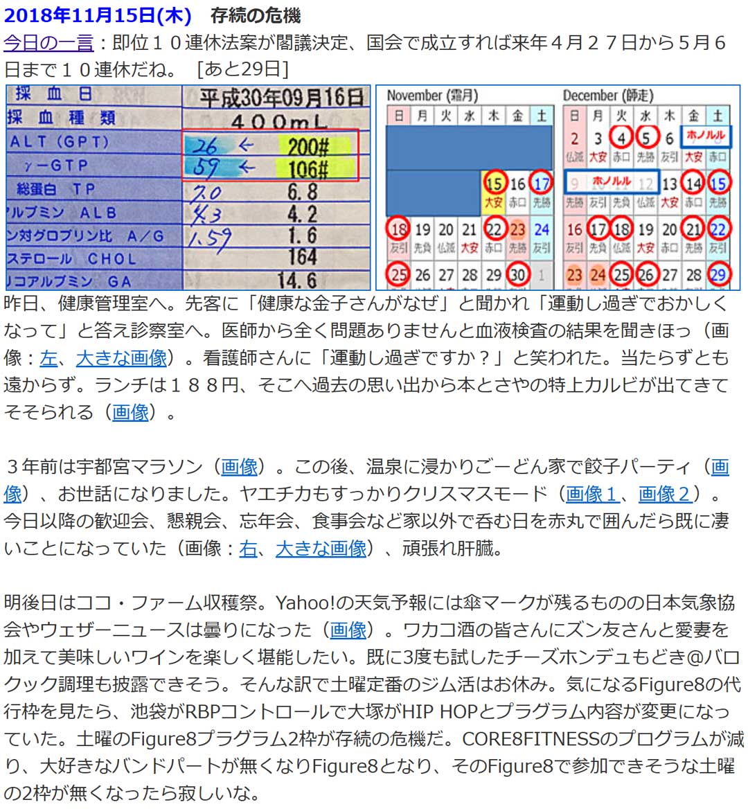 過去の思い出から、7年前(右、大きな画像)は、2か月前にゴール手前で前のめりに崩れ落ち救急搬送され直後の血液検査のALT、γ-GTPの数値が跳ね上がったものが正常値に戻り安堵。サラリーマン卒業まであと29日ということで、呑みの予定を赤丸で囲んだら凄いことになっていた。卒業はしたけど再雇用が4年続くことに。当初の予定の3年で終えていれば良かったという想いもあるけど、そうしたら今の仕事には出会ってなかったと思う。何事もタイミングだな。