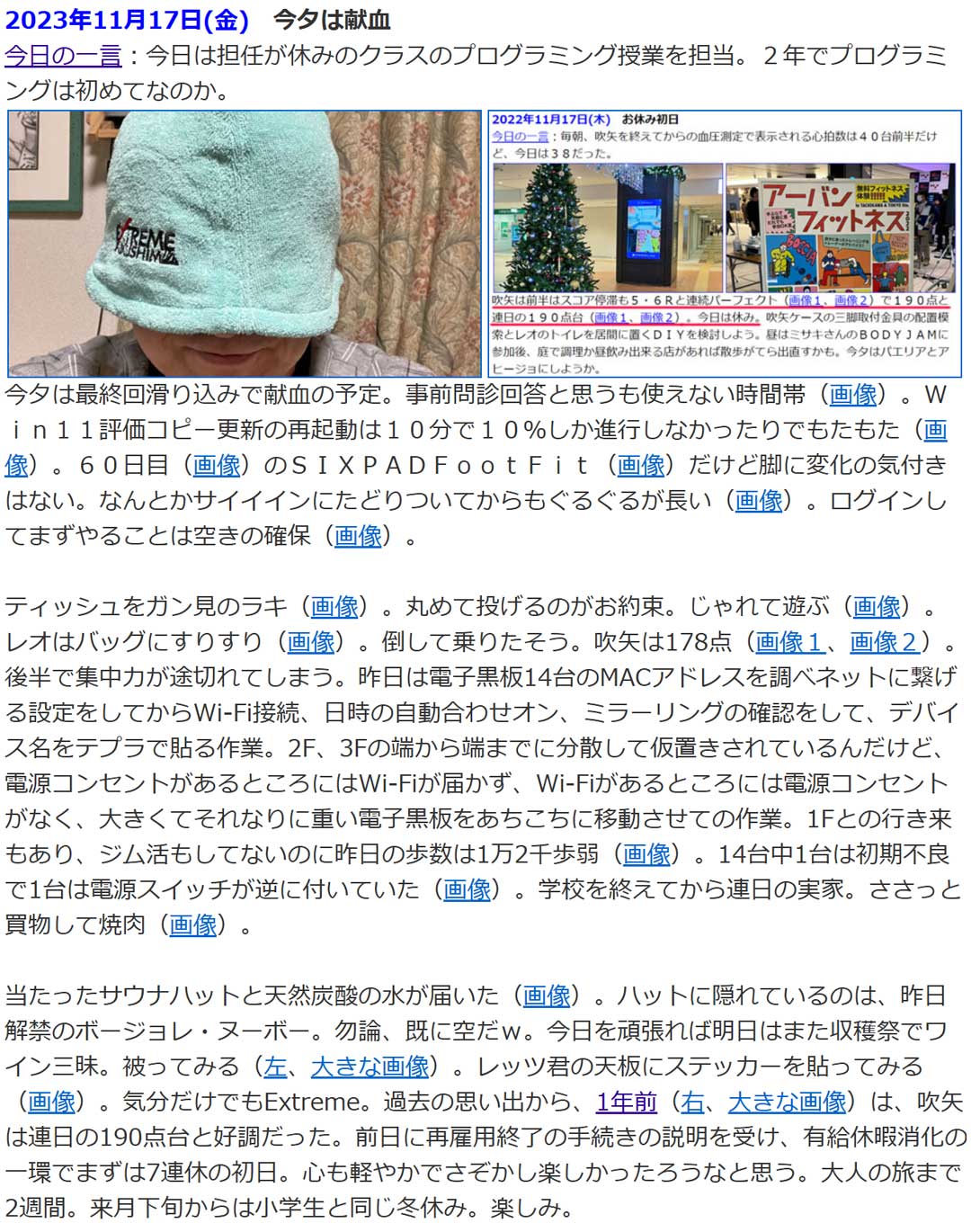 学校を終え帰宅途上の4時少し前にGSに寄ると待ち時間ゼロでタイヤ交換をお願いできてラッキー。5月(左、大きな画像)に、タイヤ交換が4千円まで値上がりしたと書いたけど、今回のGSさんは2,640円とリーズナブルで有難い。猫砂とリクエストがあったビールを調達して帰宅。昨日はふくしま駅伝があったんだけど、木曜の中学校でお隣の養護の先生が走られたはずと思い結果を見たら50人中18位と頑張られた模様。3.4km区間を13分4秒だから15.6km/h。ご主人も同じチームで参加されたと知る。素晴らしい。過去の思い出から、2年前(右、大きな画像)は、サウナハットが当たったんだった。サウナーでなくどちらかと言えば苦手なので未使用だけど、大人の旅に持参して被ってみようかな。