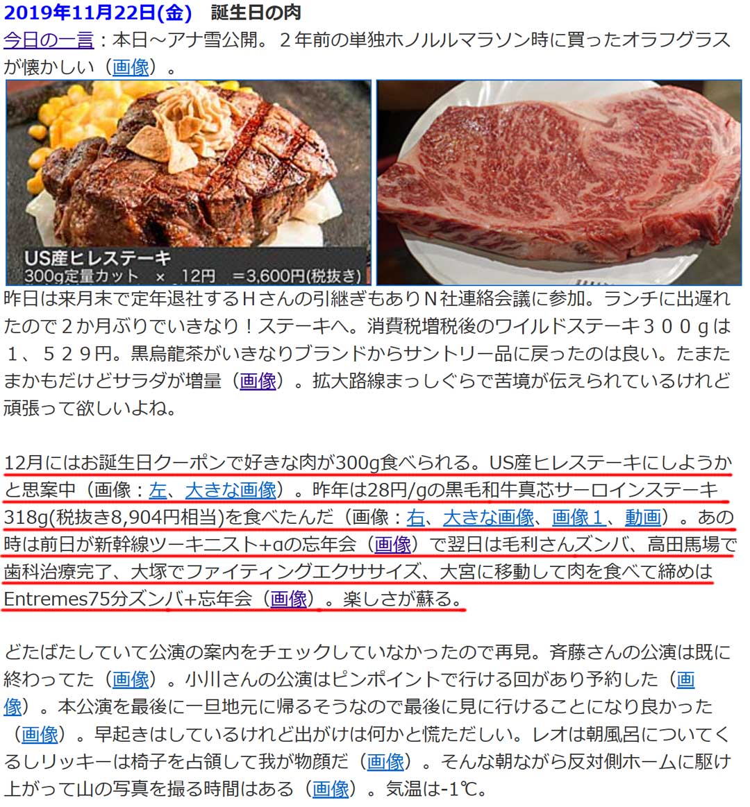 9日に8年前の鶴亀屋食堂のマグロと生ウニのダブル丼(画像)を書いたけど、当時3,800円位だったと思う。ウニの季節では無いけど久しぶりにどうかなと検索していてサービス品・マグロと生ウニのダブル丼5,500円(画像)を目にして回れ右。過去の思い出から、6年前(右、大きな画像)は、いきなり!ステーキのお誕生日クーポンの肉の話題。前年が過去最高の肉。当時は、前日が新幹線ツーキニスト+αの忘年会(画像)、当日は毛利さんズンバ、歯科治療完了、ファイティングエクササイズ、肉を食べ、Entremes75分ズンバ+忘年会(画像)。満喫し過ぎで罰があたりそう。