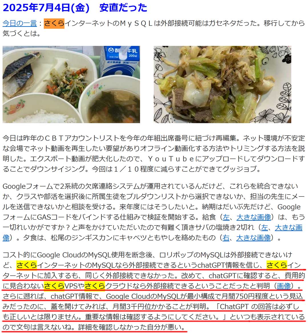 実家で父の米寿の記念誌(制作時のプレビュー画像)を見た愛妻が今頃になりしみじみと力作だねと語る。父にだけこさえた1点物と思っていたようだけど各家庭に1部ずつ配布したから我が家にもあるはず。動画5点を納めたDVD-Rも添付した。その動画をスマホから視聴できるようlolipopのレンタルサーバーにも置いてQRコードを付けたけど、lolipopは次回更新時期の来年2月に解約する予定。というのも、GASコードからMySQLへの外部接続がやりたくて、さくらインターネットに移行したから(画像)。でも、できなかったんだよね。レシピデータベースや掲示板でPHPを使ってみて、GASコードからダイレクトにMySQL接続は出来ないけど、PHPを経由すれば出来そう。そのうちまたやり出すのかも。動画5点は肖像権や著作権もあるんだけどこそっと掲載(後にコメントアウト予定)。①弟の「乾杯」(動画)②米寿祝いの席で姉&孫達のよさこいにオイラも飛び入り参加から役者の妹登場(動画)③娘が編集した新年会の模様(動画)④オイラが編集した4人で参加したホノルルマラソンの動画(動画)⑤お泊りした翌朝の解散の模様(動画)。