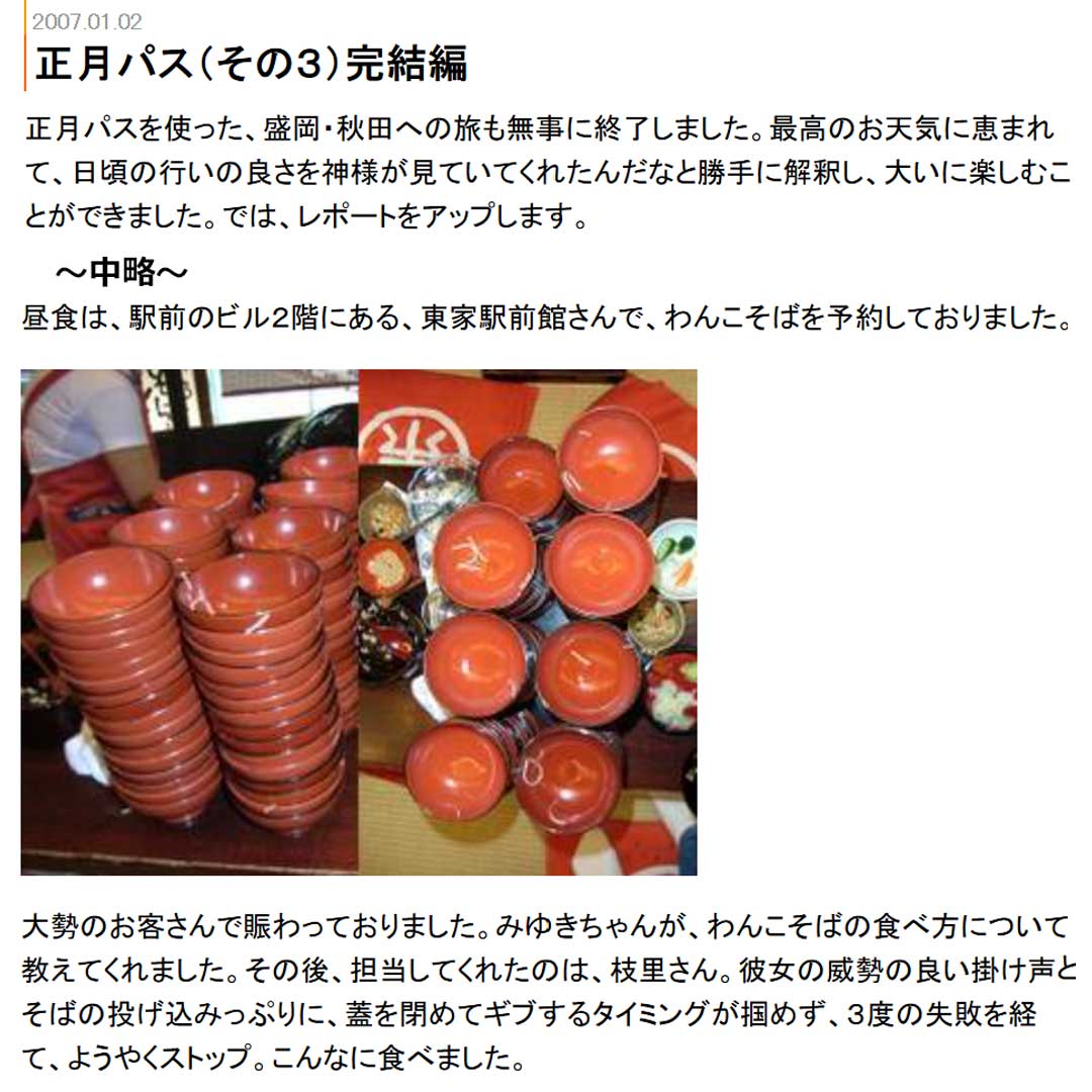 今朝の買い物(画像)。連なる山々(画像)。通信料チェックは、スマホは15/30GB、バイオは6/20GB使用と余裕。回転わんこそば(画像)が面白そうなので大人の旅で予約。1月(画像)に、わんこそば@東家を10回利用と書いた。毎回100杯クリアで頂く通行手形を並べてみる(画像)。初回の模様はココログ(画像)にある。90杯手前で挫けるはずが、枝里さんの容赦ない投げ込みに蓋閉めを3度失敗し113杯を食べることに。その後の秋田はお腹が苦しくて目当ての郷土料理を食べられず苦くも印象に残る正月パスの旅。7年前(画像)は、台湾のお姉さんに一緒に写真を撮らせてと言われ楽しかった。