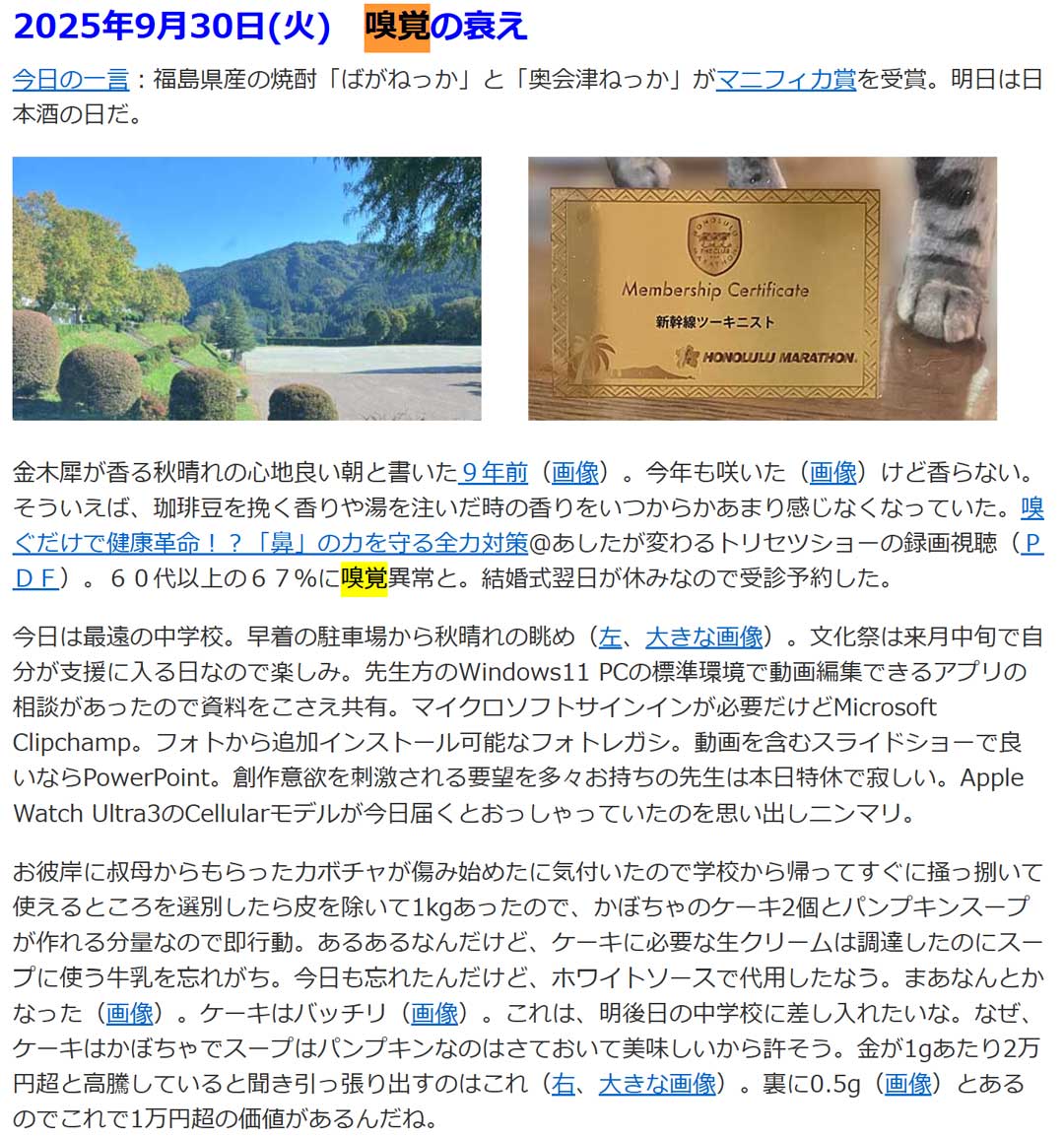 出勤途上の信号待ちで駐車場から出待ちの車があり可愛いお姉さんだったので、いや誰でもだけど、入れてあげた。丁寧に2回もお辞儀され、ハザードランプでの感謝もされて良い気分。エレベーターでお先にどうぞをしてスマイルを頂いていた頃を思い出す。今はエレベーターに乗る機会がないからなあw。今日の小学校は、1週目が祝日、2週目が学校行事の振替休日、4週目が振替休日ということで、今月は今日だけの出勤。学校ホームページでErrorが発生している件の原因調査。記事中に全角の二重引用符が使用されていたのが原因と分かる。半角にするか使わないかを提案して無事に解決。iPadから教室のプリンターに印刷する件では1台に無線LAN故障があった以外は正常動作。Googleフォームでアンケートを行う件は不慣れな先生からの依頼だったので作成後の取り扱いなども丁寧に説明して無事に終了。