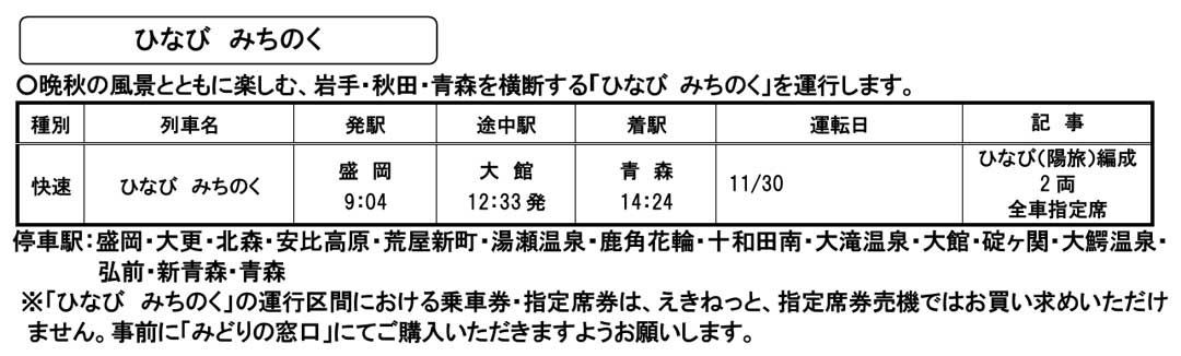 新青森駅のブナの森で三食そばネギ抜き(画像)。玉子の大半は残した汁の中。盛岡までは指定席を取らずに空いてる席に座れるけど、修学旅行生の大集団(画像)が延々と。七戸十和田、八戸と2回続けて移動することになった。それでも最後まで座れて良かった。たまたまTVerで充電旅を見たら八甲田ロープウェイから一戸の世界遺産を目指す行程だった。強風や乗り遅れで7年前から3回連続ロープウェイに乗れず。オイラが乗った時は素晴らしい眺めだった(画像)。あれだけ下るなら回生充電が出来たら良いのにと思った。現在、四戸はないけど、一戸から九戸まで並べてみた(画像)。七戸の位置が微妙。車販さんが旅サラダの大仁田美咲アナ似だったので何か買って差し上げたくなるも弘前ナイトの後なので手が上がらずw。盛岡で東北本線に乗り換えようとして臨時列車ひなびみちのく(画像)のお見送りのイベントをやっていたのでちらっと見学(左、大きな画像、動画)。レンタサイクル利用も頭に浮かんだけど湯冷めすると嫌なのでやめた。盛岡⇔繋温泉を往復したのは大人のデビュー旅の時だった(ココログ)、行きは向かい風、帰りは追い風ながら雪粒も混じる行程。行きは1時間20分、帰りは45分とあったが、標高差(画像)が影響したね。仙北町で降りると100円自販機がリーズナブル。喜盛の湯まで歩いてまったり湯に浸かる。岩風呂、美泡の湯、高濃度炭酸泉、不感の湯。他にも寝湯、シルキー湯、打たせ湯、サウナなど。盛岡に戻り北上川沿いに店が並んでいるのに初めて気づく。遠野食肉センター盛岡木伏店はジンギスカンを楽しむ方々で賑わっていた。オイラはビアフロントベアレン盛岡駅前でヴァイツェンとジャストワンモアピルスとカツオのたたき(画像)。柳家フェザン店でお初の納豆キムチラーメン(画像)がボリューミーで美味しかった。