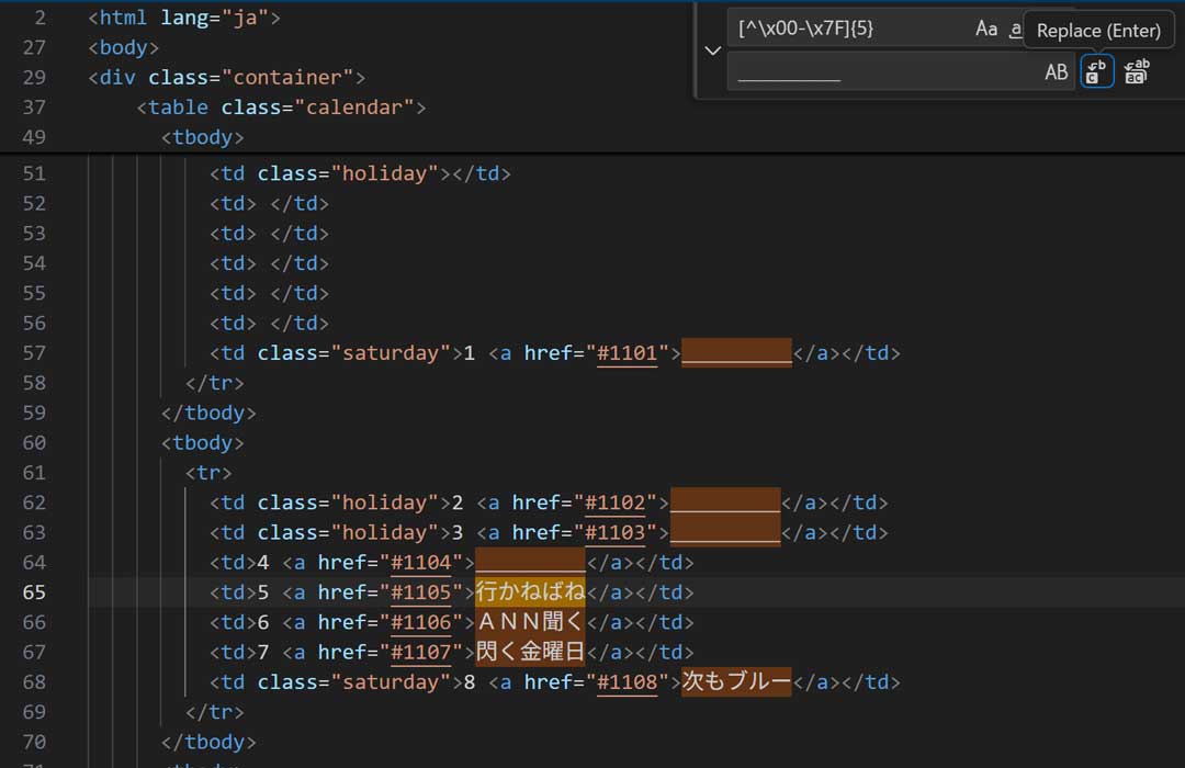 新宿の次は宇都宮へ。一本松開店時刻まで間がありオリオン通りを散策するも間が持たず東武宇都宮の8Fにある銀座ライオンで琥珀ビール(画像)とソーセージ。動き回った後もあって美味しかった。17時から一本松。ママ&パパの語らいが、今は利用できない食いもんや暖さんのご夫婦のようで、まあ楽しい。お通しは大根の漬物、みそマヨきゅうり、旦那さんの地元・烏山の柿、ポテサラ(ちょい盛りの盛りが凄い)、おまけのマカロニサラダ。アジフライ&ハムカツのセットが嬉しい。飲む方は、黒霧島、三岳、初心者お断わりの焼酎をロックで飲んだところで、備蓄していたのを今日持参したという三岳の春薩摩旬あがりが出て来て(右、大きな画像)さらに2杯w。楽しかった。ソフトボールの月別報告書を市教育総務課へ提出して今シーズン分は終了。11月のHTML文書から12月分を準備。長く使用しているHTML/CSSエディタ「StyleNote5」で月の部分を置換して、全角5字のタイトルは手入力で「_____」に置換していたけど、Visual Studio CodeのReplaceで「[^\x00-\x7F]{5}」を「_____」に置換できる(画像)と知った。何でもやりようがあるね。