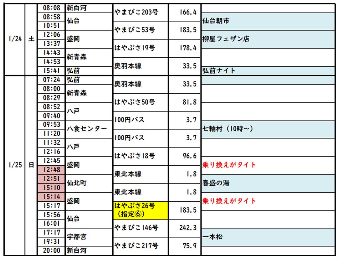 大人の休日倶楽部パスの旅が終わったばかりなのに、今年度最後のシーズン(2026年1月19日~1月31日)が近づいてきた。自分の場合はピンポイントで1/21(水)~25(日)に早くから決まっている。となれば24日(土)は弘前ナイトなのでホテルを予約して前回パスした八食センター・七輪村を復活となれば土日はこんな感じだろうか(右、大きな画像)。ナカジマ会館の天玉そば、小嶋屋のへぎそば、たつのや商店の立ち飲み、宮下銀座のハシゴ旅も入れたいとなるともう一杯かな。その前に、1月5日(月)~7日(水)での九州行きもあるな。仕事始めは8日(木)から。