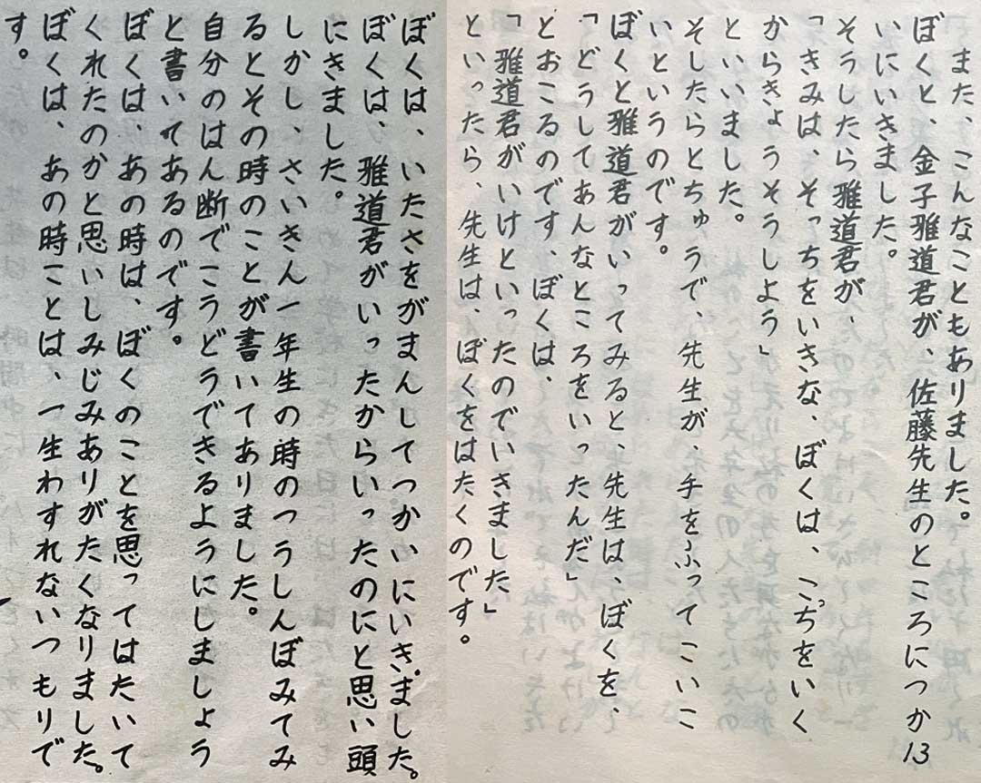 嘘ではないけれど、同じく小1の時、授業中に先生から友人と一緒にお使いを頼まれ、友人に別経路を指示し競争して叱られたことを思い出した。卒業文集で友人がそのことを書いていた(左、大きな画像)。卒業文章に書くぐらいだから彼にとっては痛い思い出だったんだね。悪いことをしたと思う。中学生になってから学校帰りに彼の家に寄ったことがあるけど、彼が作るラーメンを作ってくれ、拓郎や陽水のことを熱く語るものだから、自分も聞くようになったんだった。彼はスカイセンサーを持っていて羨ましかったなあ。それにしても、宿題をやらなかったオイラ。小学校高学年では、算数の昇級テスト結果で最後尾から45人の席順を決めていた。常に最後尾をキープしたし、上級生より昇級していたのが当時のプチ自慢。
