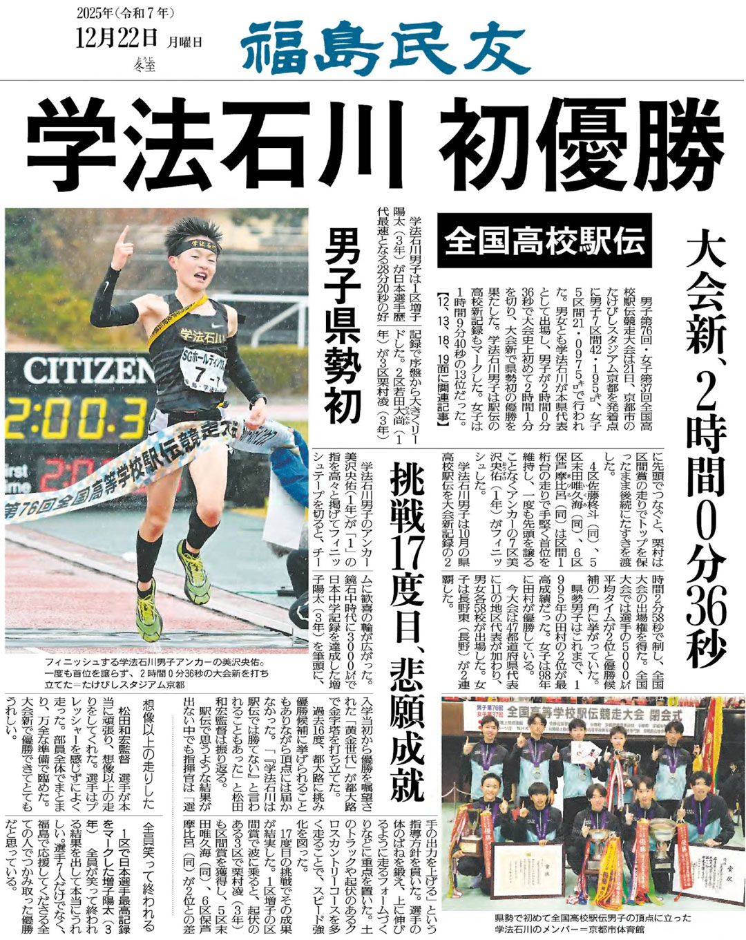 全国高校駅伝でが学法石川男子が大会新で初優勝(画像)に拍手。今日は冬至。今日を含めて今年は残り10日。今週の朝ぼらけのテーマ(画像)は、「今年の日記~あなたの今年に一言~」なんだとか。日記がテーマなら、久しぶりに投稿しようかなと思う朝。第一候補は、ママチャリGPのトロフィーゲットかな(左、大きい画像)。一発で決めた争奪ジャンケン(動画)。