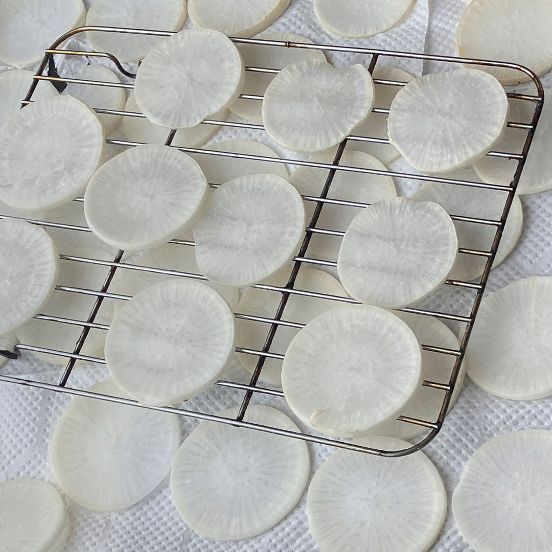 柚子を頂いたので柚子巻き大根(レシピ)をこさえよう。かつて叔母宅のキン婆ちゃんから手を出せと言われ柚子巻き大根や菊の甘酢漬けを載せられペロッと食べるしか無かったのが懐かしい。大根を輪切りにして天日干しもどきを狙い暗いうちから並べた(左、大きな画像)。父が食べていた印象はないけれど持参したら食べてくれるだろうか。歯の具合が悪いから無理かな。
