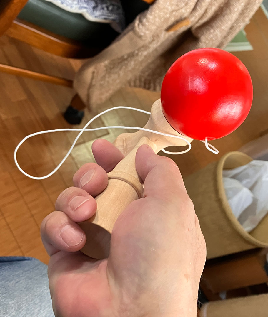 気温は低いけれど、天気は上々で穏やかな元日の朝。 娘夫婦に刺激されて、新年早々けん玉をやってみる。とりあえず、一番簡単なやつは成功(画像)。とはいえ、やるべきはけん玉よりも吹矢だね。昨年9月からご無沙汰だけれど、再開して6段位に挑戦したい。 今年の男料理始めは、かぼちゃのケーキ(画像)とスープ(画像)でかぼちゃ尽くし。 朝は餅を焼いてお雑煮で頂く。沁みる。