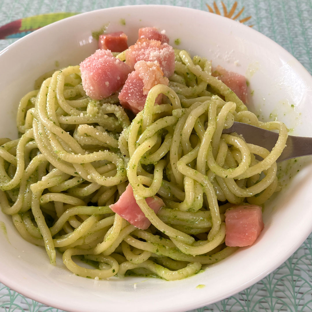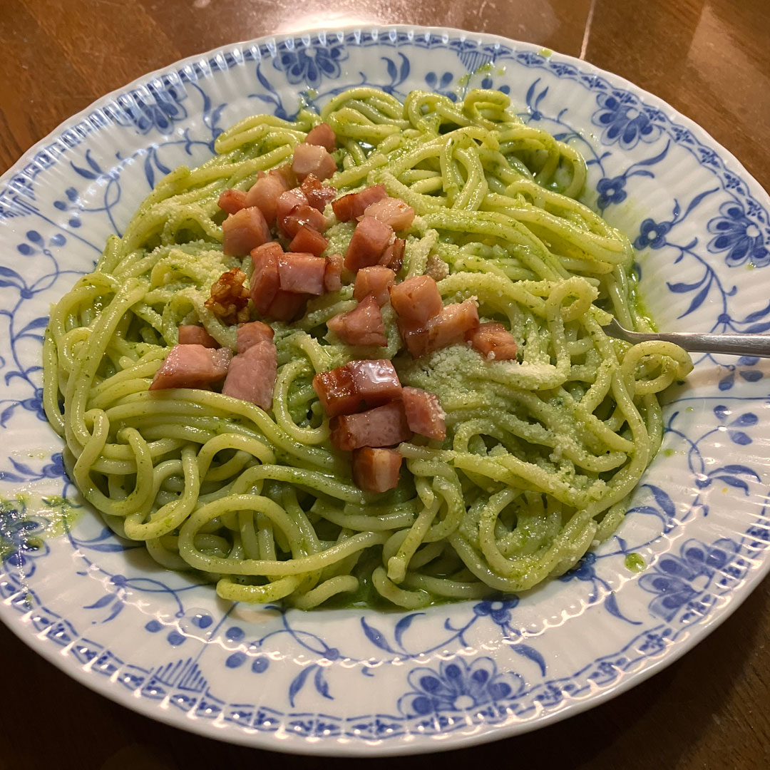 今日の給食は東北味めぐり献立。笹かまの磯部揚げ(宮城)、ひきないり(福島)、ひっつみ(岩手)などが並んだ(画像。ひっつみにはネギがたっぷり入っていたので、真っ先に平らげたw。ahamoのデータ残量は、粘りの0.91GB(画像)。今日の一言に書いた通り、冷凍のジェノベーゼソース(画像)と自家製麺(画像)でジェノベーゼパスタ(右、大きい画像)。美味しい。冷凍で3週間以上は問題無し。