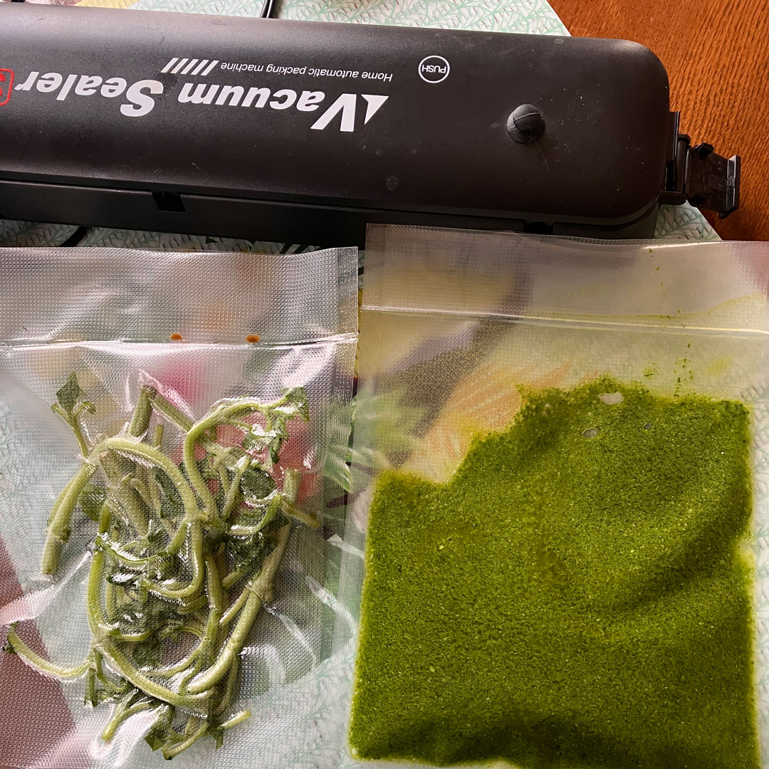 朝は、サラダ(左、大きい画像)を追加。昼は、芋煮の残り汁で作るカレーうどん(画像)とピザを頂く。連日のボール遊びの様子を上空から(右、大きい画像、動画)。取り寄せたバジルの残りでジェノベーゼソース4人前をこさえ、2パックに分けエア抜き圧着(画像)して冷凍保存。少なくとも1週間は遜色ないことを確認済み。