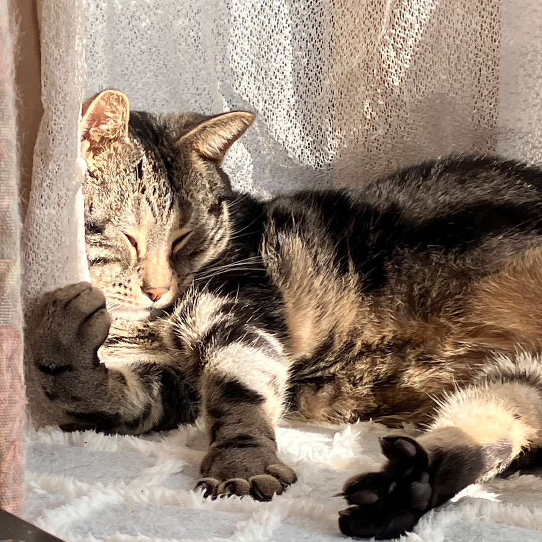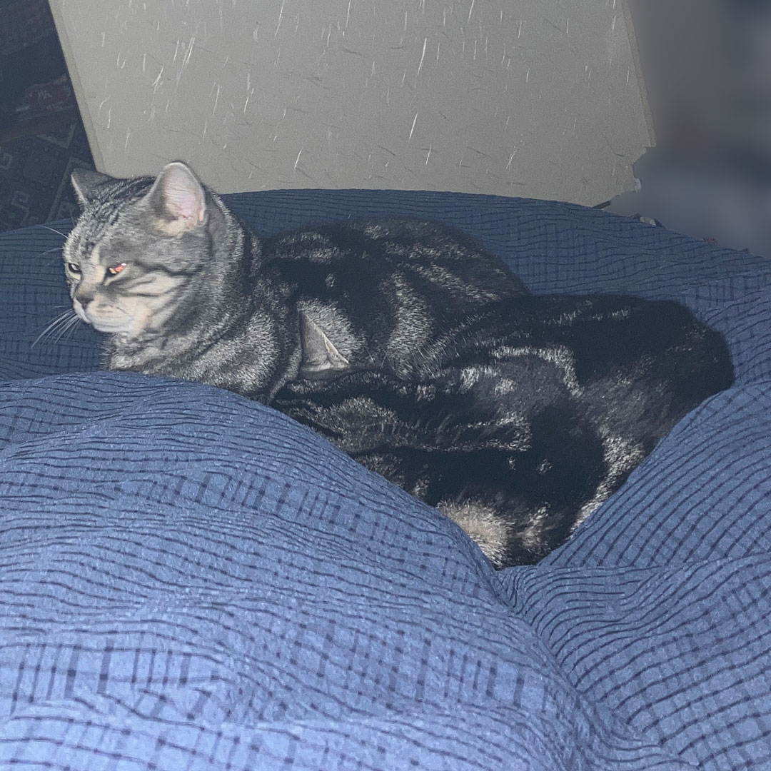今日配信されたプロボノの9話を横になりながらスマホ片手持ちで1.5倍速視聴してから起きる朝。アップルウォッチのライトを点けずに暗い中で立ち上がったら平衡感覚が怪しくてふらつきそうになった。視力の助けも借りないとまっすぐ歩けない。朝ご飯を待っていた猫達。食べ終えて寛ぐ猫達。静かになって落ち着きを取り戻したラキ(画像)。賑やかな正月だったから無理もない。
