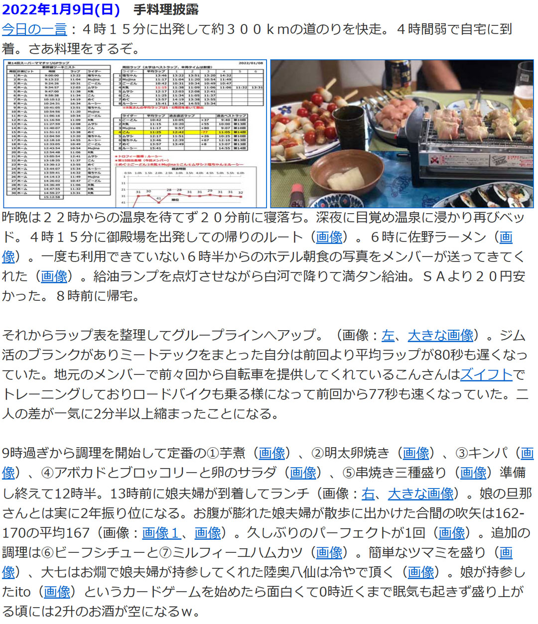 過去の思い出から、4年前(左、大きい画像)は、ママチャリの記録が落ちて体重との関連をまとめていたw(画像)。さらに劣化して今年は走れる感じではなくなった(画像)。引退間近ながら、来年の参加の栞を早くも作り始めた(右、大きい画像)。それから、おおよその連絡先に、水戸観梅オフが3月1日で、大宮花見オフが3月28日との案内を済ませた。