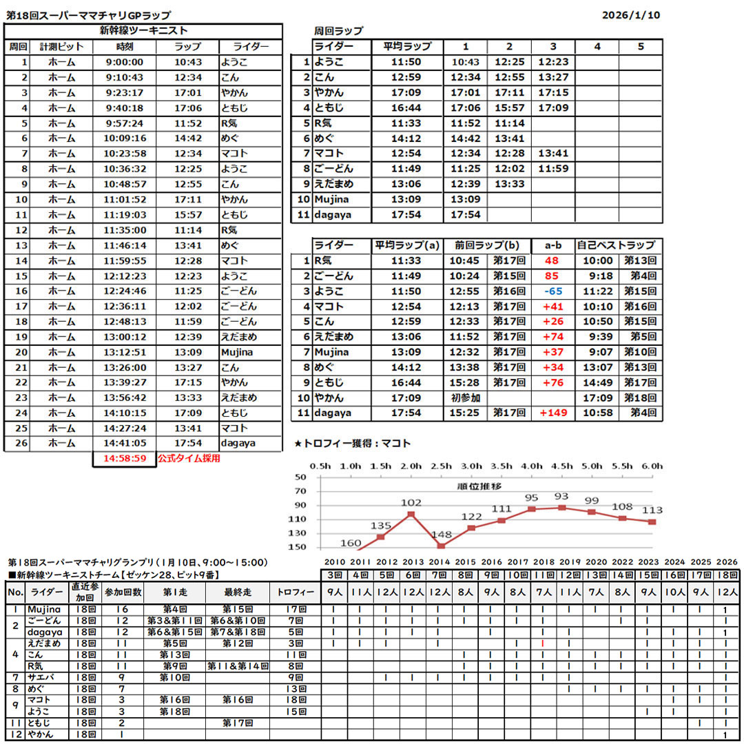 スタートシーン(動画)。還暦走のごーどんさんは駆けつけ3周を走りタイムも含め流石。連続ではありませんが、えだまめさんも2周を走りました。オイラは1周で終了。ジム活をやめ、1年ぶりの自転車で、体重も増えていたらタイムが落ちるのは当たり前(画像)。このままフェードアウトして現地で芋煮でもこさえてバックアップに徹するのが良いのかも。来年も走るならせめて12分台には戻したい。新幹線ツーキニストチームは無事に走り終えて113位(左、大きい画像)。