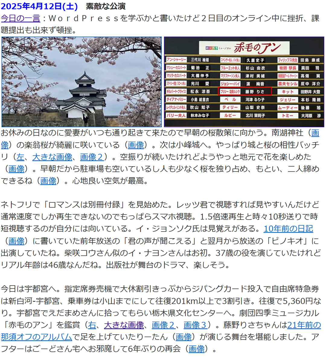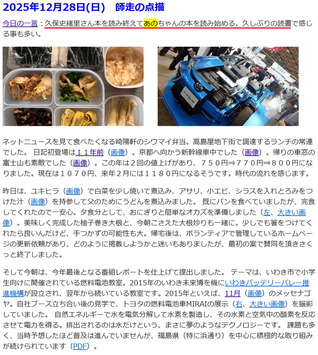 3分弱の番組から1200文字を捻り出してレポートを作成し提出する朝。短いネタを膨らませるのは骨が折れるけれど、慣れてしまえば時短の楽しみが見えてくる。今日から二日間は実家通い。姉の依頼をこなしつつ、主戦場は台所でのマッサンシェフ(愛妻にそう呼ばれているw)。父がいかに箸を進めてくれるか、献立を練り、時には会話で攻めの姿勢も見せながら、完食してもらう。