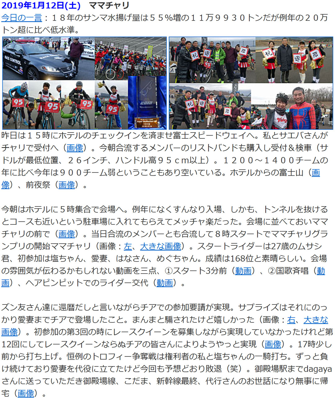 帰宅して休肝日もありかと思ったけど、従姉妹から旦那さんお気に入りの日本酒を頂き、飲み始めちゃった。純米にごり生酒(画像)は度数以上にきくね。1月の怒涛の前半が無事に終了。ちびちび飲みながら日記更新中。今日中にはアップできるはず。過去の思い出から、7年前(画像)は、還暦直後のママチャリグランプリでサプライズもあり最高に楽しかった。
