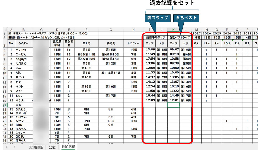 年末に提供した仕組みが順調に稼働しており特に急ぎの案件もなくのんびりととした一日。残り1時間でExcelの相談が舞い込んだのでちょうど良かった。年間計画表で月別の日数や時数の集計や年度に応じて年間カレンダーの曜日を自動更新するようにしたり。折角なのでうるう年判定を加え2月29日の有無が自動で処理されるようにした。本日も無事に終了。来年のママチャリに備えてラップ計算のExcelを改良した。スプレッドシート化して現場で誰でも入力できるようにしたのは今年運用済み(画像)。参加記録シートに直近ラップと自己ベストラップのデータを追加(画像)。皆さんに配布したり公開するリザルト(画像)は、VBAマクロも使いcalcと書いた黄色のセルをクリックするだけで自動処理されるようにした。