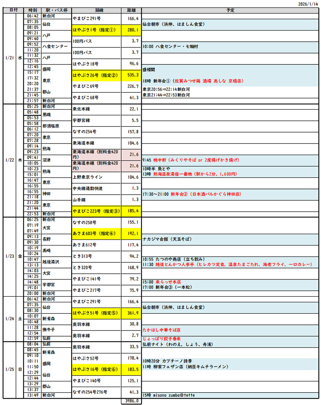 予定が確定しないまま大人の旅が1週間後に迫り、たつのや商店が水曜定休で越後とんかつ人参亭は木曜休みが多いので越後湯沢を金曜にしたら次々とピースが埋まった。夕方には、青森大人旅をアテンドとした元同僚との新年会が水曜にはまり遂に確定(右、大きい画像)。水、木、金と3連続新年会、弘前ナイト、misonoズンバで締め。赤字はお初のところ。