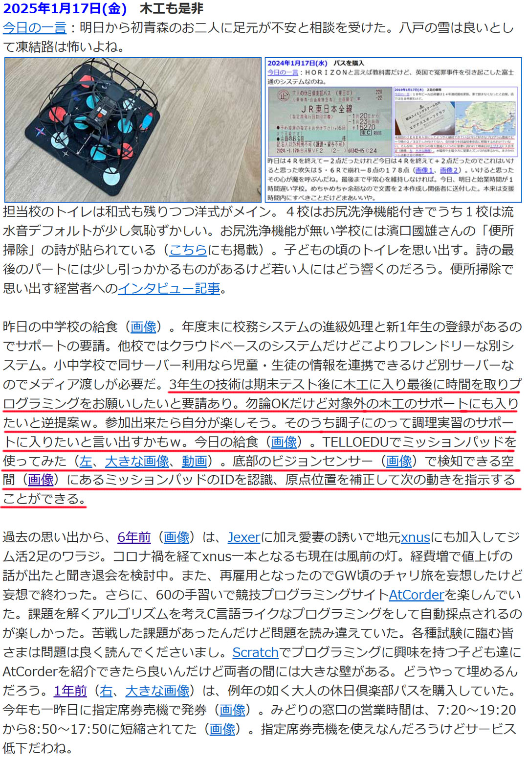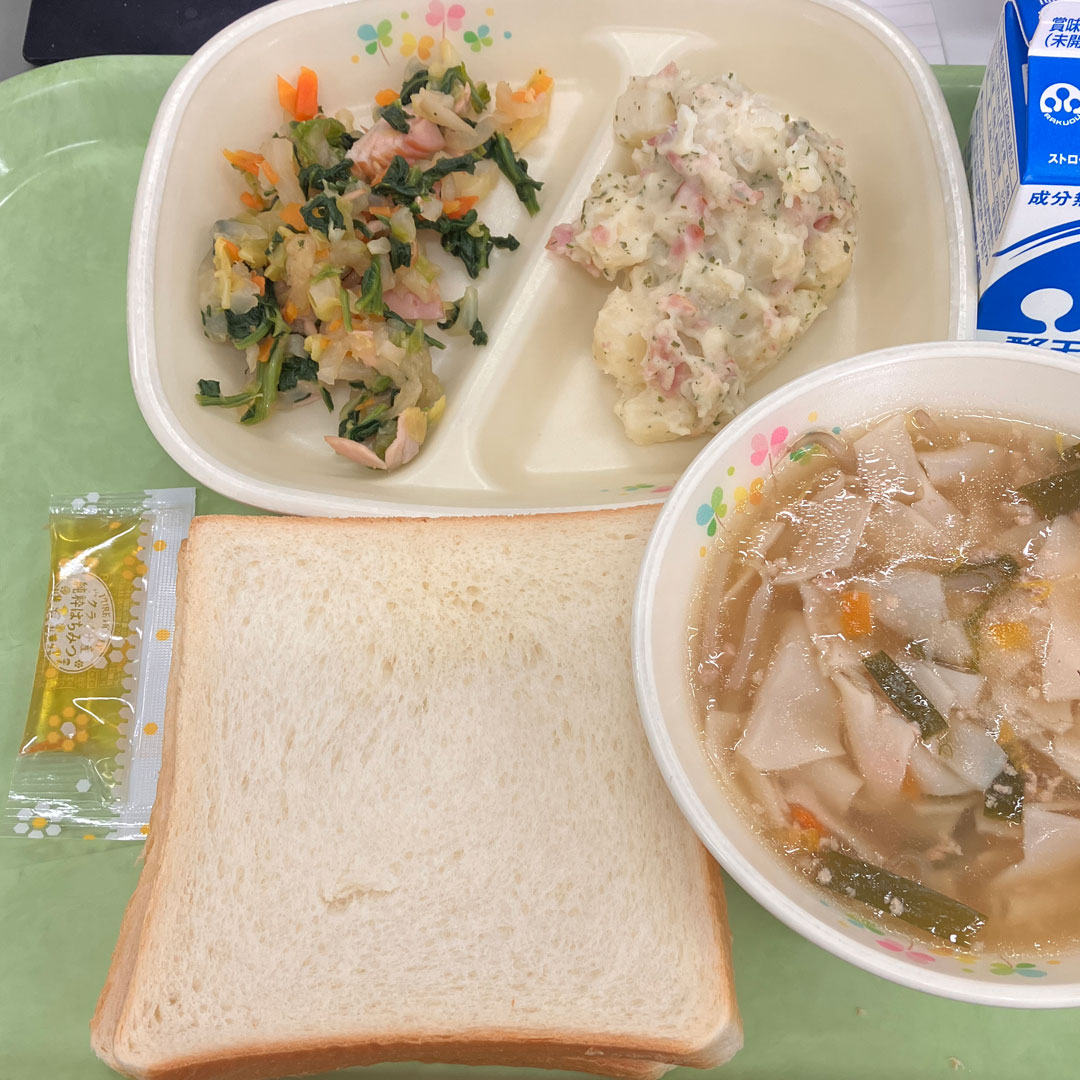 今日は中学校へ。2年生は、はんだ付けで製作した教材をタブレットに繋ぎ、プログラミング演習。合間に、オイラは、演習の締め括りとなる双方向通信やサーバー・クライアント演習の確認を行う。3年生は、グループワークの成果物をまとめ、提出する日。Googleドライブでの素材共有環境の検証が間に合わず、自前の環境を構築したんだけど、トラブルなく使えて良かった自分としても、前年度とからブラッシュアップした内容で臨んだんだけど、先生もグループワークでは勘所をつかまれたようで、次年度はより主体的にやってみたいという言葉もいただけて、嬉しかった。給食はミネストローネ(右、大きい画像)が美味しく、今週初めてネギの呪縛から解放された。PC入れ替えで印刷できなくなったインクジェットプリンターと格闘。セットアッププログラムから再設定できたと見えてダメ。IPプリンターの設定がRawモードになっていたんだけど、LPRモードにしなくてはならなかった。最後まで難儀したのが、インターネットに繋がらない生徒のタブレットだ。Wi-Fiには繋がり、pingも通るのに、ブラウザではインターネットに接続できませんとなる。検証で別Wi-Fiで試すもダメ。EdgeもChromeもダメ。接続できるタブレットと設定は同じなのに。力尽きて、最終的には、使われていない不具合タブレット3台から使えるパーツを組み合わせ代替機を1台を仕上げたところで予定を1時間半オーバー。さあ、帰ろう。