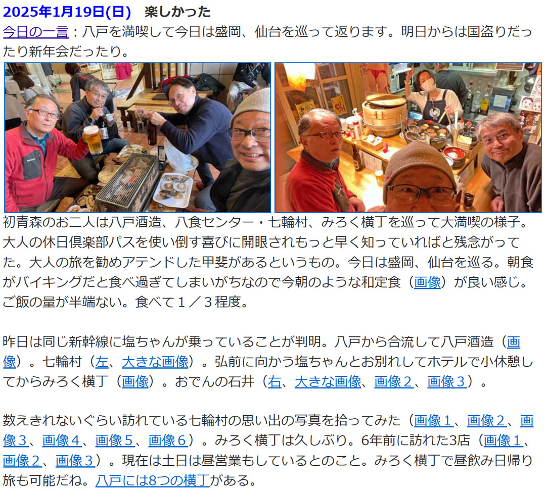 過去の思い出から、1年前(画像)は、最後の職場の同僚らと大人の旅で青森へ。八戸は塩ちゃんも合流となり楽しかった。明後日は、八食センター・七輪村スタートで、夕方は、その時の同僚らと東京で新年会。今から楽しみ。