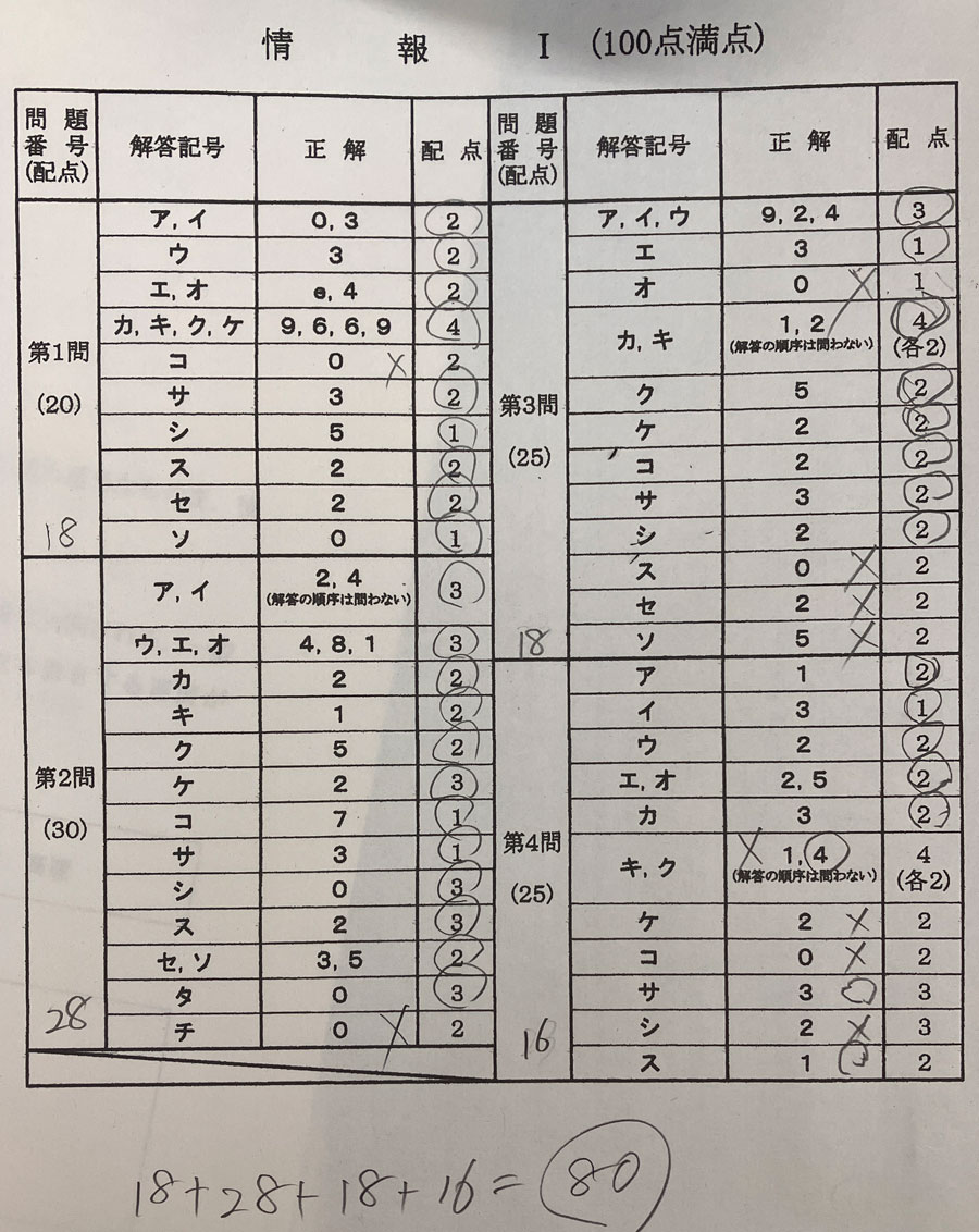 3R目でパーフェクトかと思いきや、僅かに外し(左、大きい画像)164点(画像)。ちょっかい出すレオからプリンターをガードし、共通テスト・情報Ⅰ(PDF)を両面印刷(右、大きい画像)。実際も両面なのかなと思いつつ解いてみましたが、片面印刷の方が読みやすかったですね。結果は、プログラミングと統計パートでのミスが響いて、80点(画像)。修行が足りませんね。