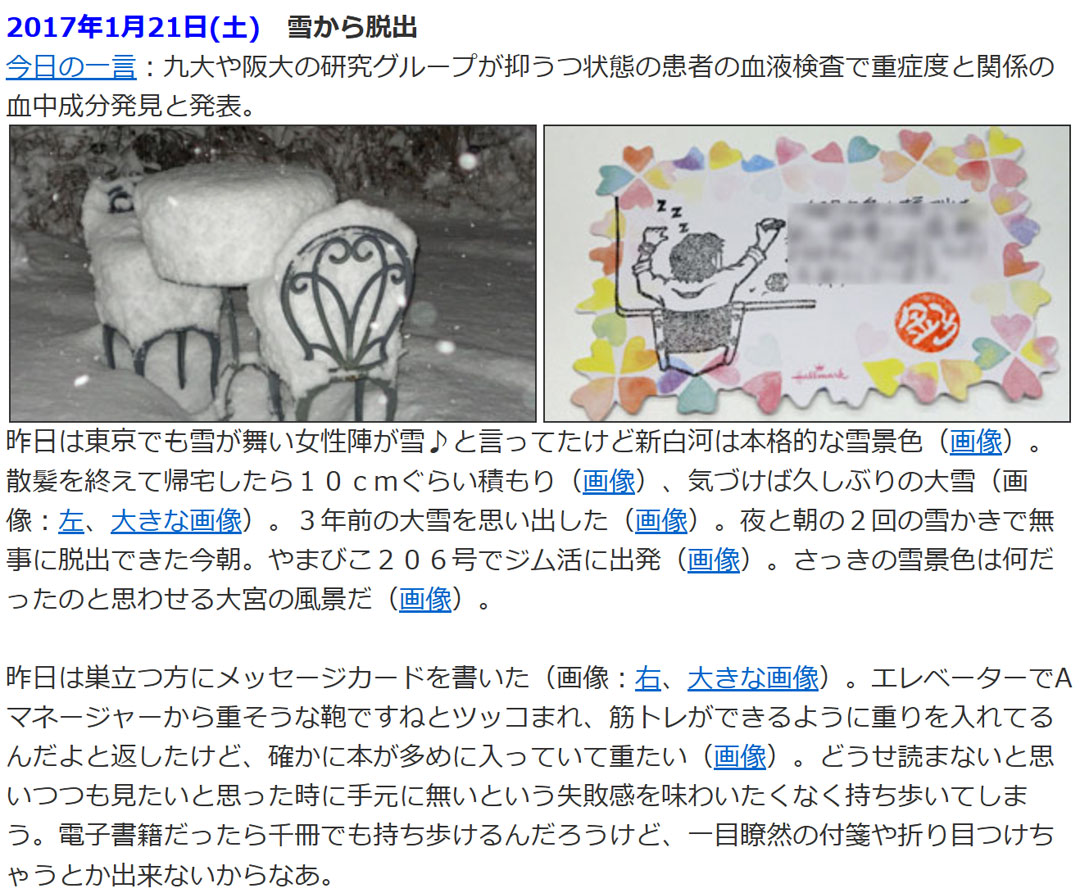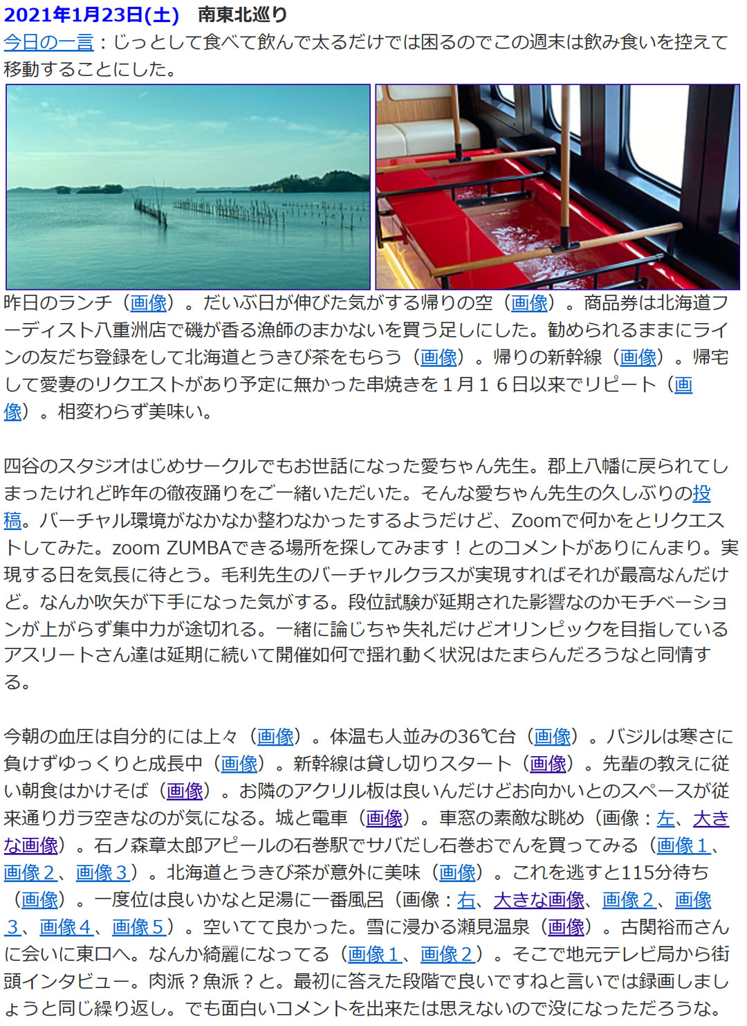 朝の番組で期間限定で空港に設置された衣類圧縮機を紹介していた。スーツケースに入りきらない衣類の容積が半分以下になり空きも出来て素晴らしい。万々歳とは言ってたけど、帰りの空港には装置が無いのでどうなるんだろう。一本松と舟清さんへ行く日を連絡。学校帰りに今年度の国保の残り2回分を振り込み、駅でネット予約済みの大人の休日倶楽部パスと指定席券の発券、愛妻分の宇都宮往復分の切符を購入。過去の思い出から、14年前(右、大きい画像)は、初の酸ヶ湯温泉。吹雪いていて酸ヶ湯温泉で折り損ねその先の八甲田ホテルまで行ってしまいホテルの方に送ってもらったんだった。酸ヶ湯温泉は大人の旅の際には必ず行けるかチェックしているんだけど大人の時期は無理っぽい。