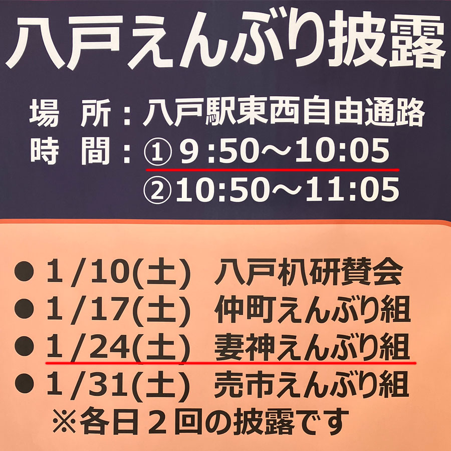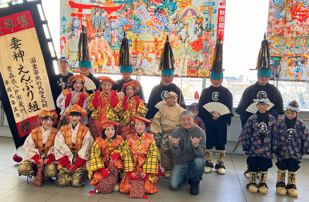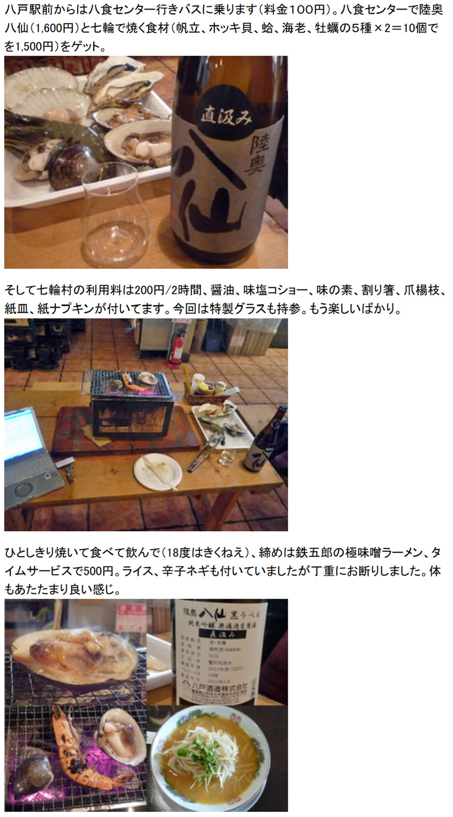 さらに冷え込み-7℃の朝。仙台朝市(画像)はましん食堂で、飛露喜(画像)と朝市丼(画像)で最高のスタート。その後、八戸へ。念願のえんぶり見学(画像、動画)で、組の皆様と記念撮影まで叶う(左、大きい画像)。まもなく、弘前を脱出した塩ちゃんと合流し、八食センター・七輪村へ。陸奥八仙をシェア(画像)。牡蠣と帆立だしの味噌汁も肉も美味しい(画像1、画像2)。