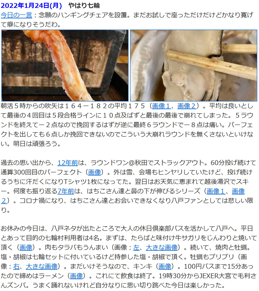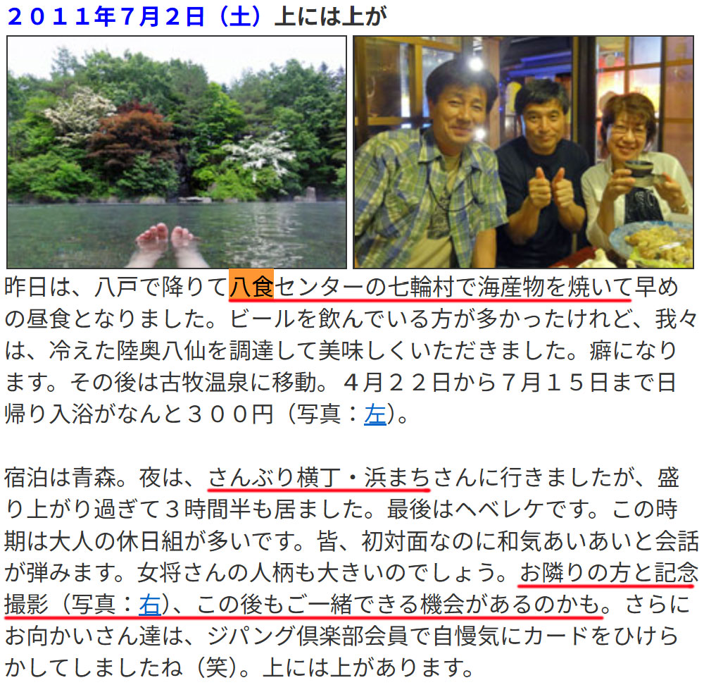 初舟清の話題に調べると、11年前(画像1、画像2)と判明。初八食センターをググると、15年前(画像)が最古。浜まちで、えねやんと出会った時だ。大人の記録では、16年前(画像)に初八食センターで七輪村にそそられたとある。その日は、秋田でストラックアウトで通算300回目のパーフェクト達成(YouTube)。15年前(左、大きい画像)、遂に七輪村デビュー。