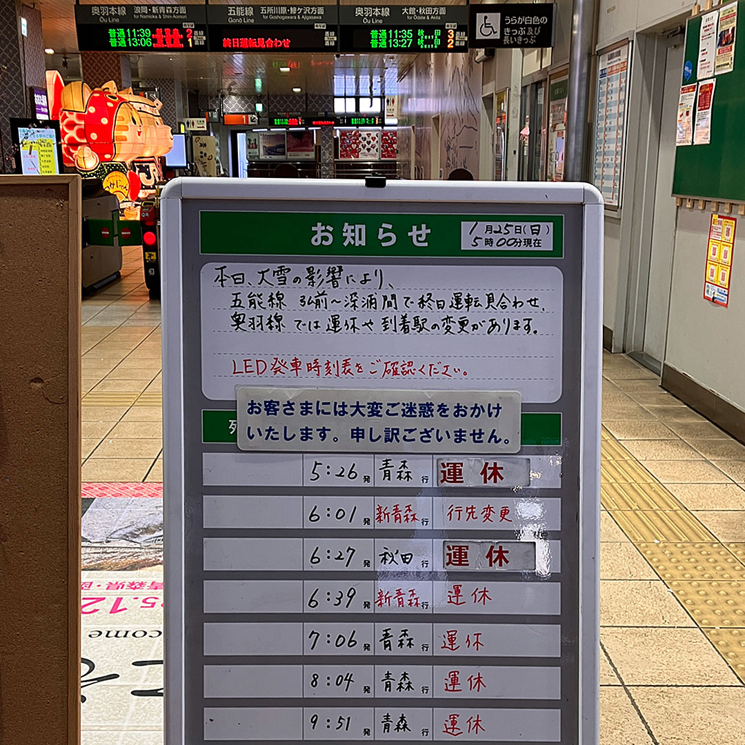 新青森へ移動するも、雪による奥羽本線の運転見合わせという壁が立ちはだかる。バスやタクシーを待つ長蛇の列を横目に、あえて駅ホーム待合室で待ちに徹した。16時までに動かなければ、16時17分の新幹線で新白河へ帰る(画像)と明確な退路を決めた。すると14時27分、2時間遅れの特急つがる(画像)が弘前まで走るというアナウンスが。諦めて多くの人があちらこちらに移動した後で、快適な特急(画像1、画像2)の座席に揺られ、15時過ぎには無事弘前へ。もがかず、じっと好機を待った大人の余裕が、勝利を呼び込んだ瞬間でした。