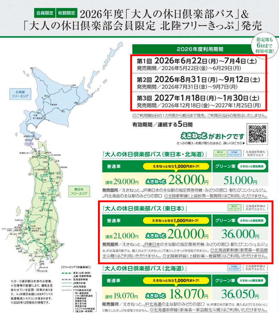 今日の給食(左、大きい画像)。ネギ入りの味噌汁をまず平らげてから、海苔包装の中央を丸く切り取り、ゆかりごはんと鮭をのせて(画像)引き上げながら握る(画像)という斬新なスタイル。先日、2026年度の大人の休日倶楽部パスのスケジュールが発表された(右、大きい画像)。今回は8月31日~9月12日の夏の陣が設定されている。東日本版は、18,800円から20,000円(えきねっと購入)へ値上げとなるけど、早くも、次の旅への期待が膨らむ。