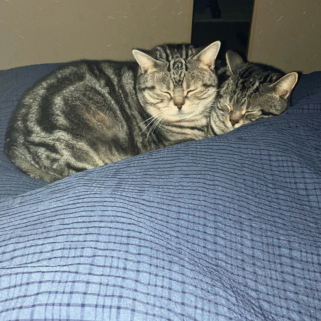 昨日に続きレオとラキの圧迫で目覚める未明。暗闇にスマホを向けパシャ(画像)。どうにも足元が窮屈で起き上がるとレオが立ち去り残るラキを布団の中へ誘う。やがて、再び、レオが足元に乗ってきた(画像)。レオも居心地の良さに気付いてしまったようだ。今日は実家へ。あれこれ持参するのを保留し父が食べそうなものを探す作戦。パンと肉が好きだからバーガーはどうだろうか。