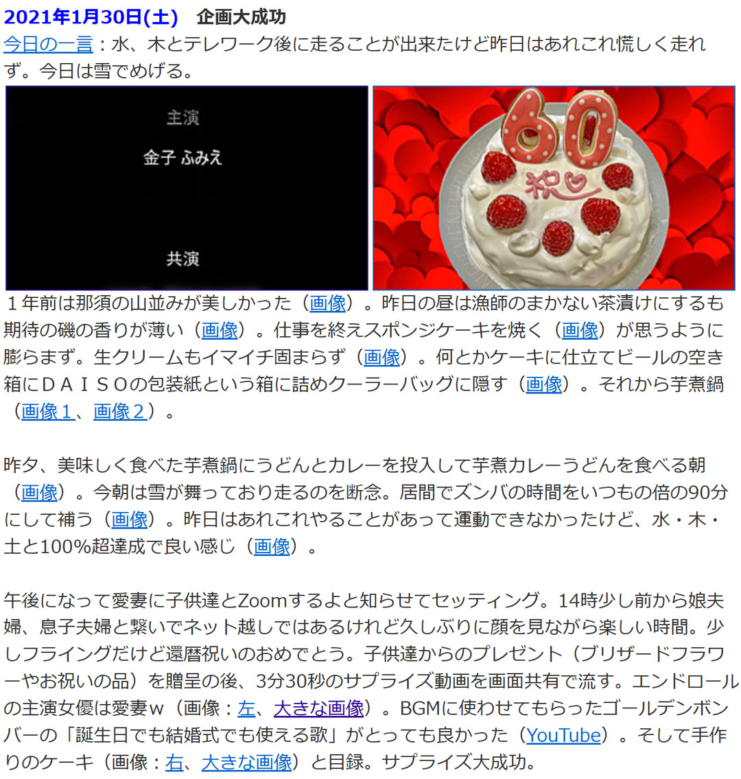 明日を残して、ahamoの通信残量0.79GB(画像)。頑張ったねえ。もう我慢せずに使っても大丈夫そう。過去の思い出から、5年前(右、大きい画像)は、還暦を控えた愛妻へのサプライズ大成功と書いていた。明後日は愛妻の誕生日。ついに、正真正銘の高齢者の仲間入りだ。時の流れを感じつつも、高齢者同士、共に新しい一歩を祝いたい。