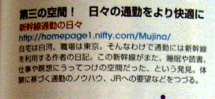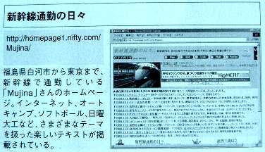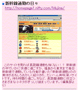 2000/9/04:Yahoo! JAPANサーファーチームから掲載する旨、メールが届く。ウレシイ!下記が紹介内容。 新幹線通勤の日々 - もはや「家から会社は近い方がよい」という常識は通用しない。毎日満員電車に詰め込まれて出勤することに比べ、新幹線通勤はどんなに快適だろう。片道2時間の道程では、新幹線ならではの優雅なプライベートタイムを過ごせるのだ。行きはコーヒーをすすりながらゆっくりと新聞を読む。帰りは缶ビール片手にノートパソコンでメールの作成。自宅が会社からはるか遠くにあるというハンデを十分克服するどころか、うらやましいとさえ感じてしまう。ここの日記にはそんな新幹線通勤での経験談、車内にあふれるドラマや事件が満載だ。 関連カテゴリ - 交通 > 通勤2000/5/29:1日限りだが、Yahooに掲載された日は凄かった。1日で3,500件超のアクセス。掲載内容はこちら。