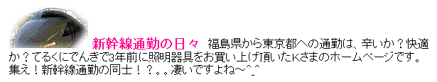 福島から東京まで新幹線で通勤している作者のサイト。ページが豊富で、かなり仔細に書かれている。「新幹線通勤の実際」では、通勤時間・定期代など、ちょっと気になる情報が満載。新幹線通勤の話ばかりではなく、家庭でのほのぼのとした出来事も書かれていて、新幹線通勤もいいかなぁなんて思うお父さんも出てきそう。