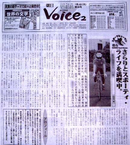 2000/6/17:取材を受ける。ホームページも紹介されることに。スポーツの話題を中心に取り上げるとのこと。レーシングウェアに着替え愛車とともに写真撮影。メットとグラサンかけて顔を隠す。実物以上に格好良く写ってくれれば良いのだが・・。ライターのHさん(掲示板にも、時々、124というHNで登場されています)から、写真を送っていただきました。実物以上です。ボイスの紙面はこちら。