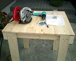 チェアの時は、電動鋸が無かったので、相当疲れました。やすりがけし、ステインも塗ったのだが、途中で無くなり、1年を経過した今でもそのまま(右写真)。